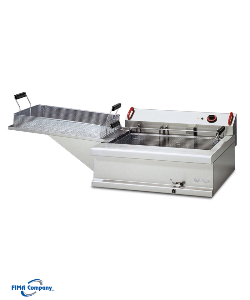 Friggitrice realizzata in acciaio inox CrNi 18/10 AISI 304, con piano di spessore 1 mm, satinatura superficiale Scotch-Brite, particolari cromati, profili arrotondati. Piani dotati di alzatina posteriore. Modello – Friggitrici pasticceria elettriche, per uso professionale, ad alta potenza e con ampia superficie riscaldante. Con vasca di larghezza e profondità ottimale per fritti dolci, con coperchio e con cesto in rete d’acciaio cromato lucido, protezione resistenze e aggancio cesto, a garanzia di assoluta igiene. Hanno un doppio termostato: di lavoro e di sicurezza. Scarico olio frontale. Manutenzione – Cruscotto porta resistenze asportabile per una totale pulizia. Dotazioni – Piedini regolabili in altezza.