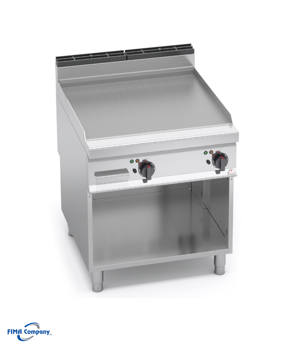 Piano di lavoro e pannelli frontali in acciaio inox AISI 304. Interno in acciaio inox. Resistenze in acciaio inox Incoloy poste sotto la piastra di cottura. Controllo termostatico e termostato di sicurezza a riarmo manuale. Regolazione della temperatura da 50 a 270 °C. Spia di linea e spia di raggiungimento temperatura. Piastra liscia in acciaio satinato ad alto spessore, a tutta misura con paraspruzzi a filo. Due zone con comandi separati per una regolazione indipendente ed ottimale della temperatura. Superficie di cottura leggermente inclinata con foro di scarico di grandi dimensioni e convogliatore in apposito contenitore. Ampio vano completamente in acciaio.