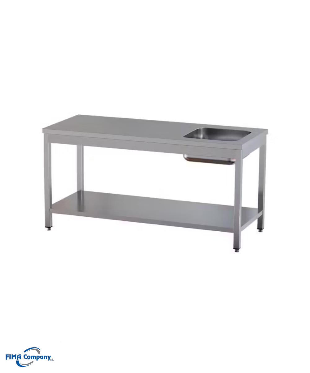 Tavolo da lavoro in acciaio inox con ripiano e vasca saldata a destra profondità 70